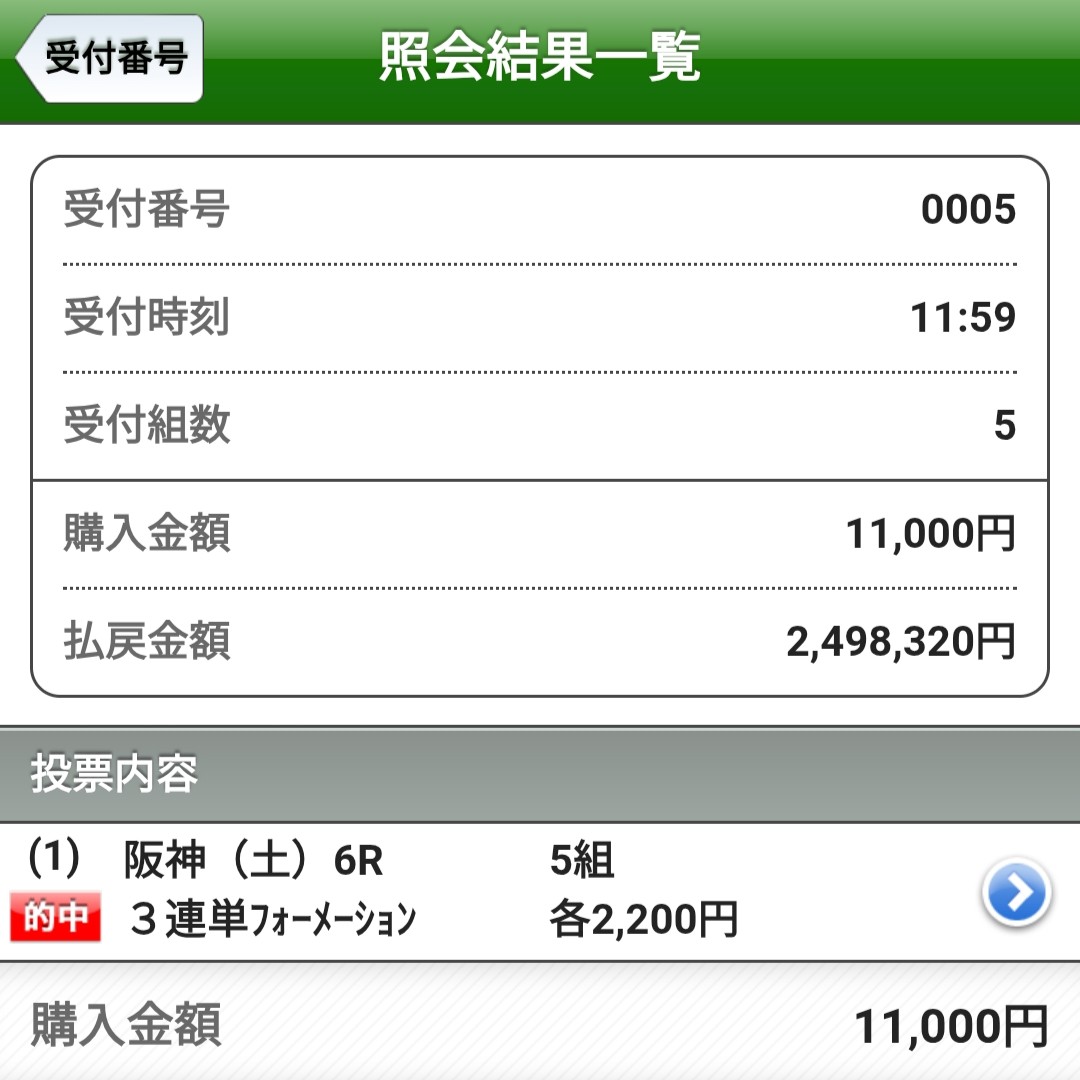 阪神6Rでの払戻金、なんと2,498,320円です。